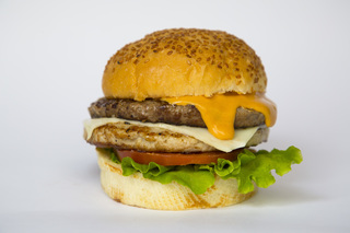 Бургер с говяжей и куриной котлетой и с сыром.